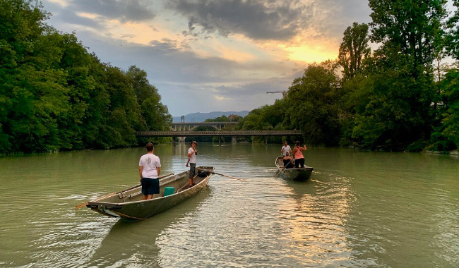La navigation en barque à fond plat sur le Rhône et le Lac Léman remonte bien au Moyen-Age, mais probablement même au temps des romains. Aujourd’hui, la Société des Pontonniers de Genève est une association sportive qui maintient cette tradition et propose des activités variées pendant toute l’année. Nous nous entraînons toutes les semaines à remonter le Rhône à la gaffe et à le traverser à la rame. Nous proposons des cours pour les jeunes et moins jeunes entre juin et septembre pour leur faire découvrir ce sport nautique dans un paysage unique, au cœur de Genève. Venez ramer avec nous! C’est du paddle à ancienne….